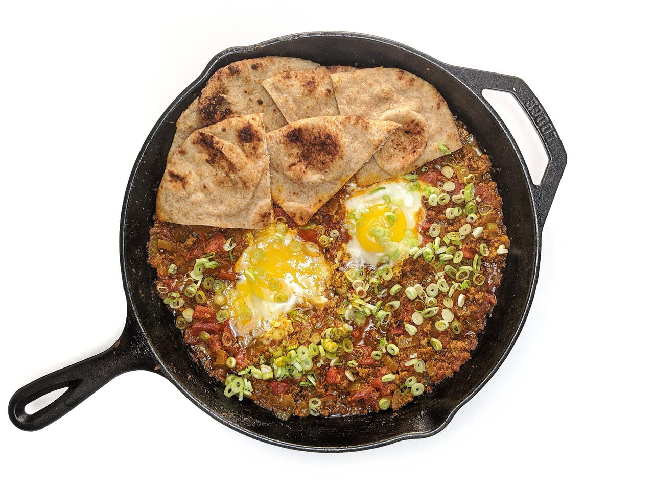 With your wooden spoon, form two divots in the surface of the sauce. Crack an egg into each divot. Continue simmering until the eggs are nearly cooked through. If you're having a hard time getting the eggs to cook, just pop the skillet under the broiler for a few minutes.