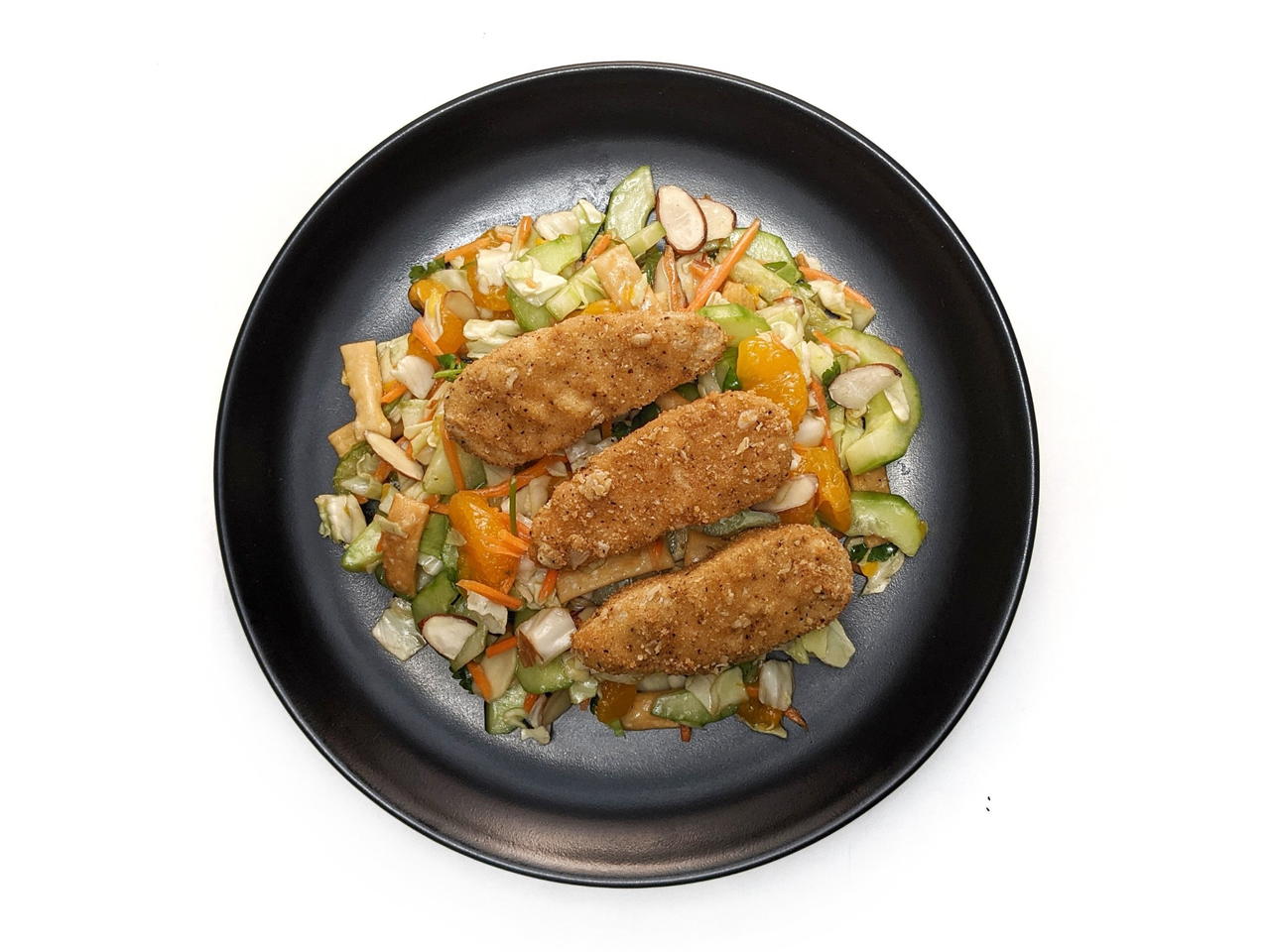 Your salad kit probably came with some crispy toppings. Mine came with crunchy wontons and sliced almonds. Add those to the bowl now as well.