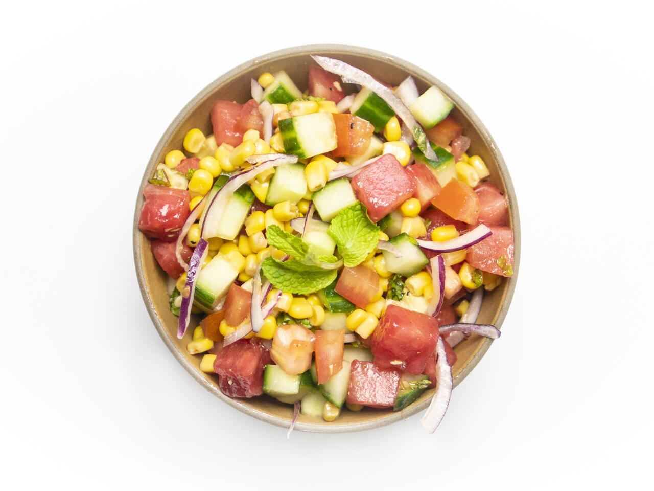 Gather ingredients. Cube your watermelon into about 1 inch chunks. Cube the cucumber and tomatoes into about 1/4 inch pieces. Dice the onion and the mint. Open and drain the water from the corn can.