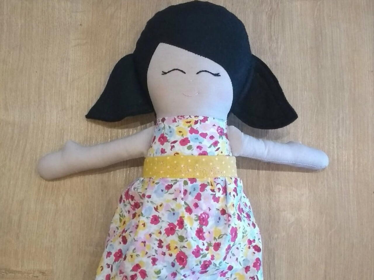 Position the pony tails, sew the dress to the hair, position the legs and arms and sew around