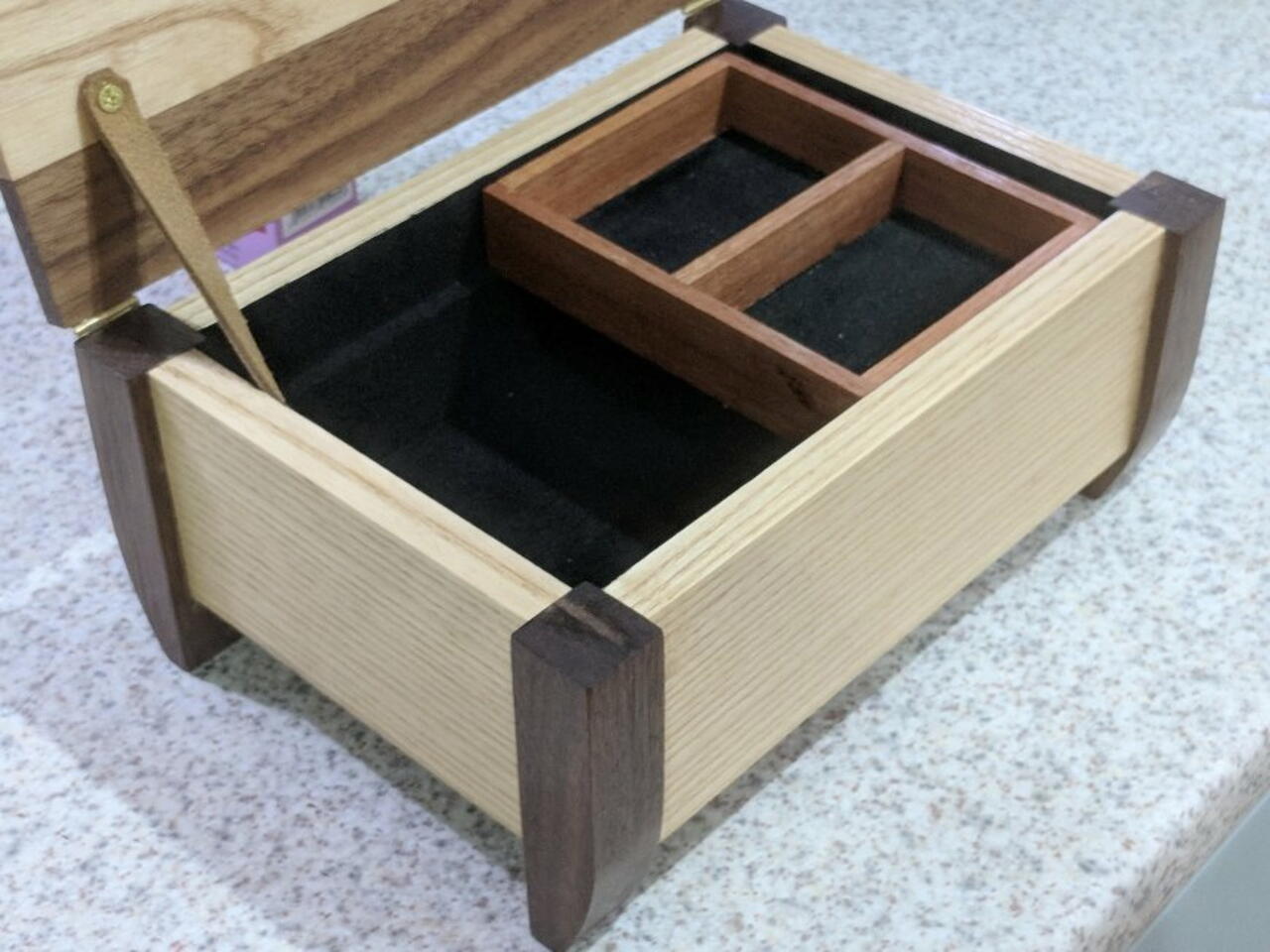 I made mine out of strips of Walnut and Ash for a decorative effect. This was joined to the box by 19mm hinges. These are my nemesis (hinges), so I put the hinges on the outside and I don't think they look too out of place ?