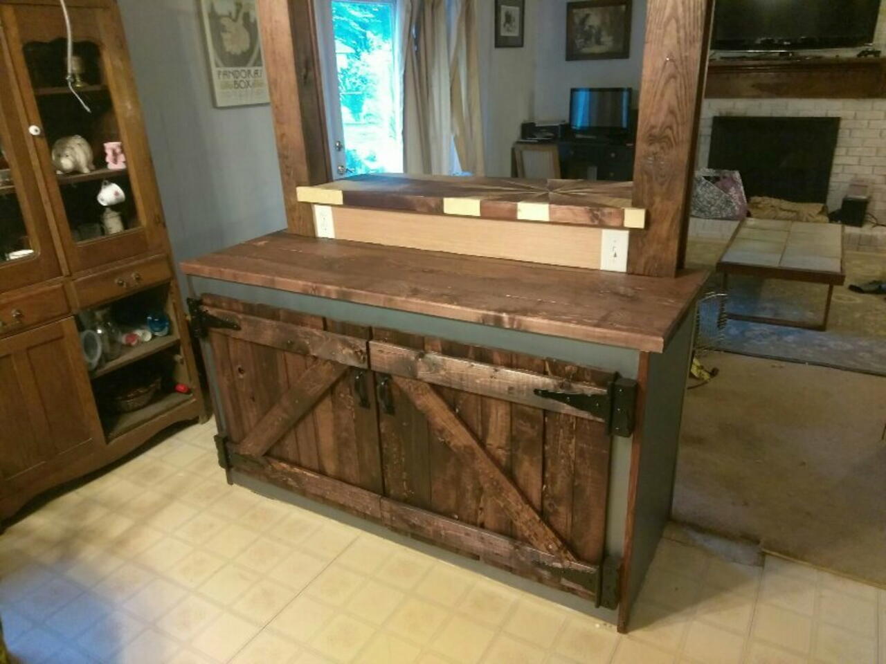 I removed my LR/kitchen dividing wall and built a pass through custom industrial bar. Finished with a hand stained sunburst fade and about 9 coats of polyurethane