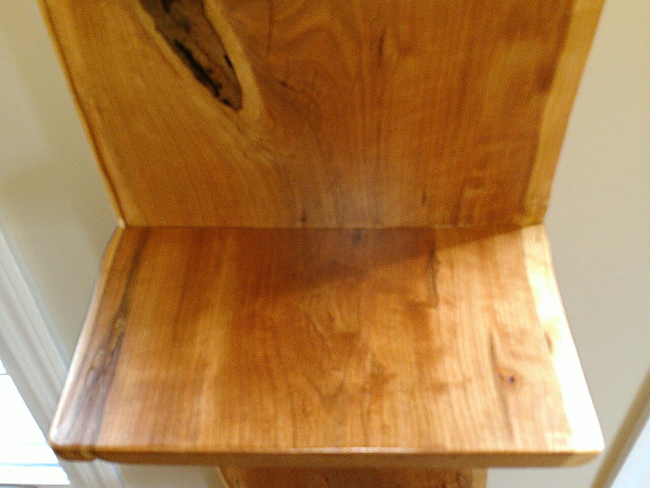 Shelves screwed in from the back. Care was used to align the wood grain. Three coats of General Finishes urethane, satin. The knot in the slab was filled in with epoxy.