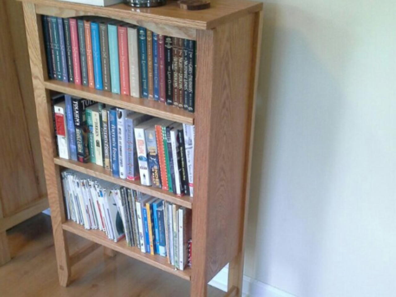 Standard bookcase construction. Here I did shelves 9" deep and 24" wide with 10" between them. Dado slots for the shelves and I used a router for a dado on the 2" wide posts to fit the sides into. Mortise and tenon towards the base.