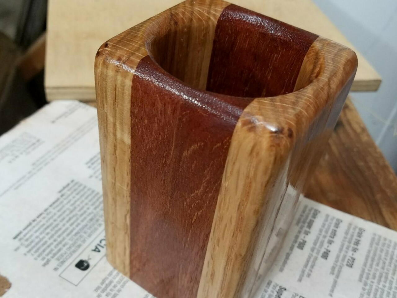 I made this project to be used at my upcoming wedding this November. This will hold pens/markers for my guests to use when they sign the guestbook. I made this out of mahogany and white oak. I used 4 pieces of mahogany and 2 pieces of white oak because that is what I had on hand. It's a simple project that looks great on any desk or work surface.