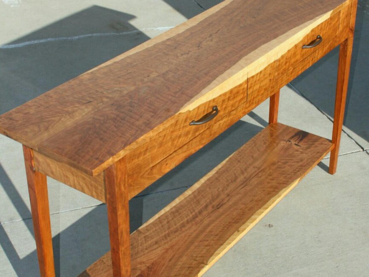This is a sofa table I made using bookmatched curly cherry lumber. I kept the sapwood rather than cutting it away, and spent some time lining up the cuts/wood grain/sapwood to get it to look right. Beautiful lumber -- the log came from a tree removal service, and it was doomed for firewood before I showed up. Best find ever.