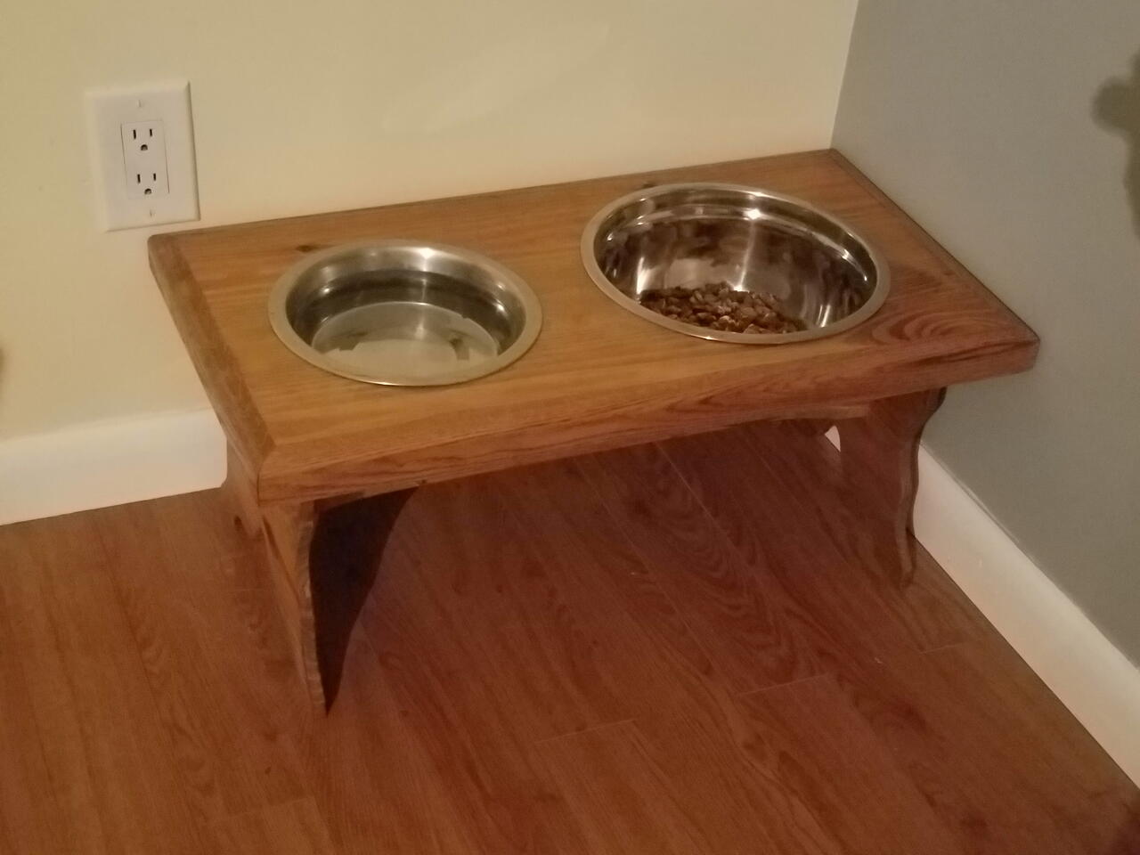 Quick and easy. Keeps the dog bowls together and off the floor. Very cheap to make since it was all scrap.