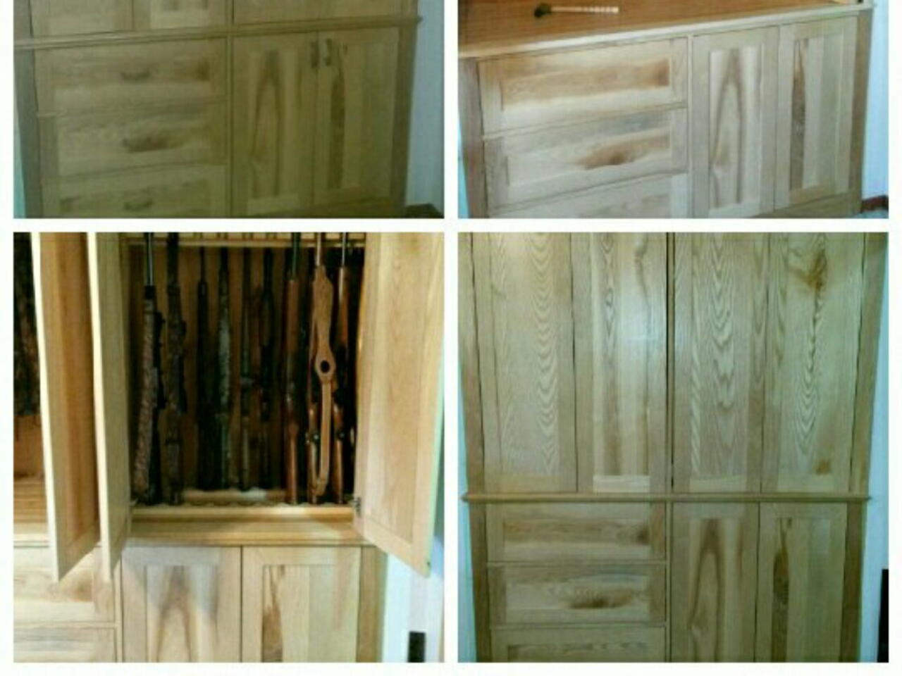 Solid wood gun cabinet with ash door and drawer faces, hemlock interior, and custom deer antler pulls.