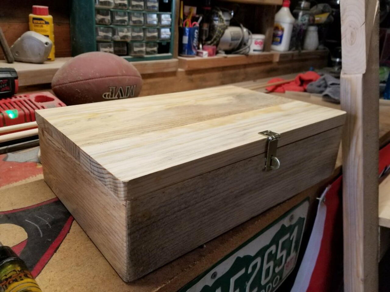 I measured the dimensions of the box and laminated 3 1x4s together to make the lid. Then took my belt sander tonite until there were to highspots.. sealed everything with teak oil, installed the hinges and lock and voila!