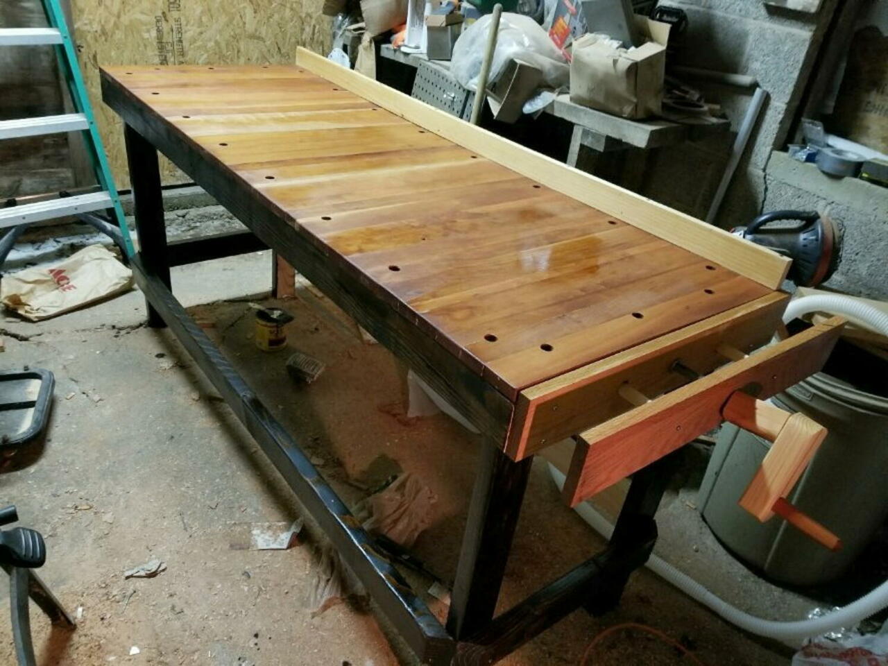 Using cherry lumber, cut into desired lengths (this will determine your benches depth when joined mine was about 30") glue edges and clamp for at least 24hrs. For added strength, you can use a biscuit joiner. I assembled my top in 2 sections.