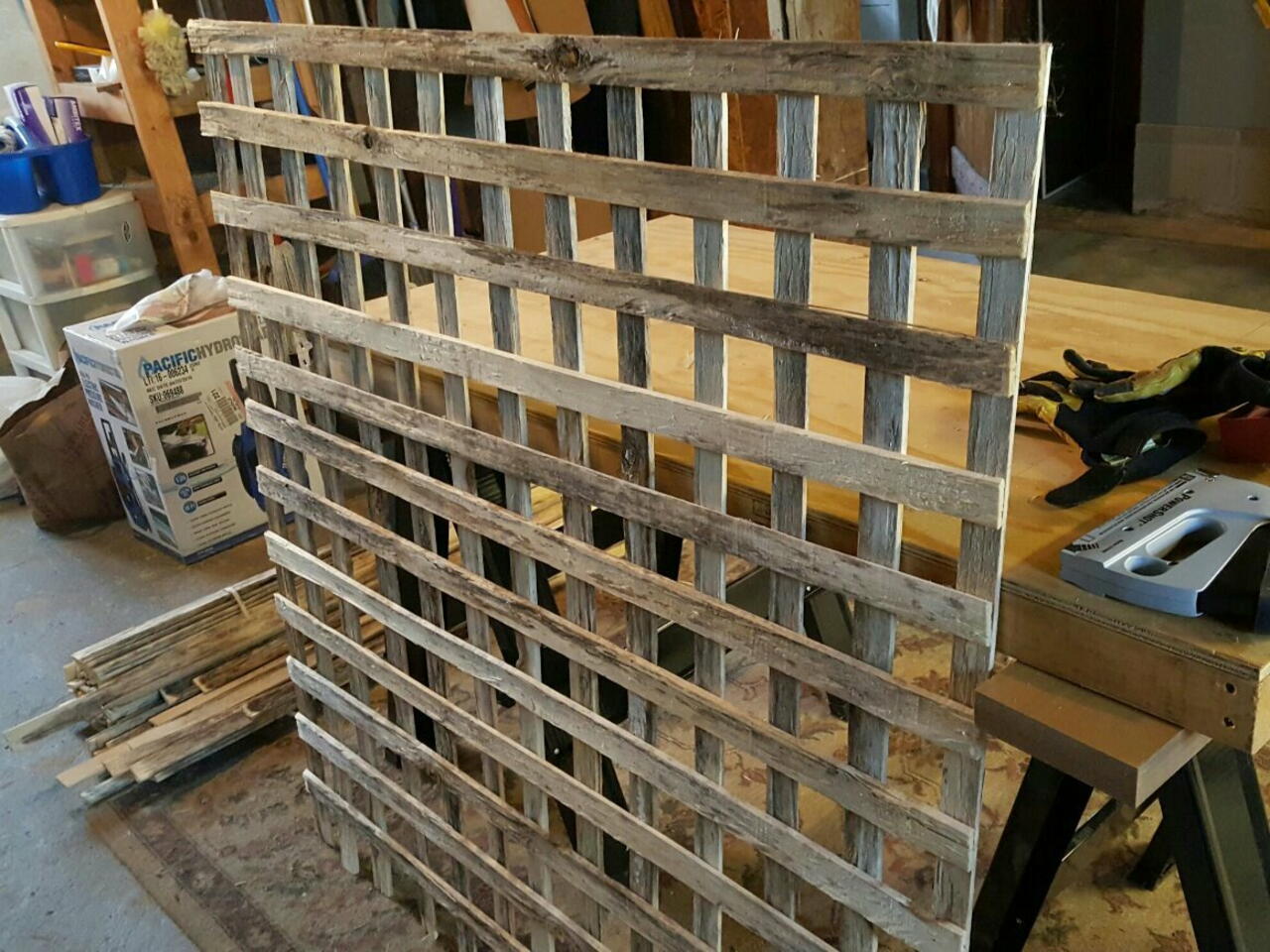 Last year we were overrun by morning glory vines. This year we're going to train them on lattice and hopefully keep them from strangling our plants. We have a lot of projects going on this year so we decided to go as inexpensive as possible with this one. We picked up bundles of lathe for about $12 each bundle. I was able to make 2 3x3 sections from each bundle. With some glue and Brad nails and a saw, this should be an easy project.