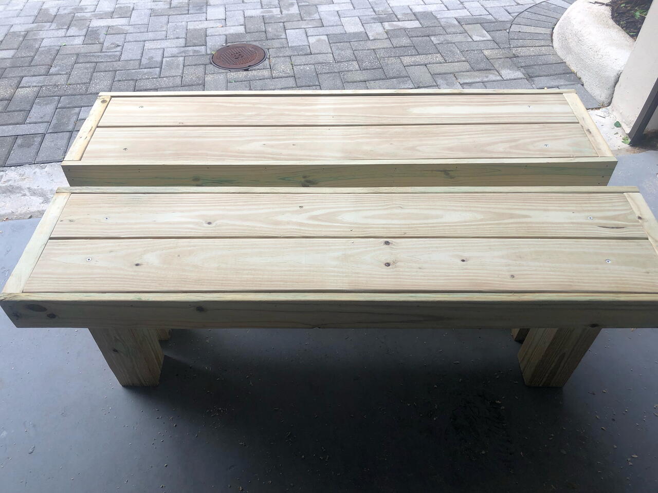 Cut 4x4 to 15 1/2 inches, then cut 2x4 to 45 inches, screw 2x4 as support in between 4x4. Then cut 1x4 to 8.5in, you’ll need 6 of those as supports for seats.Next cut 2x6 in to 4FT lengths. Screw in to the 1x4 that should be nailed down to your 4x4 posts and one in the middle of the 2x4 support beam. Then take 1x4 and cut 4- 51in lengths as trims, and 4-2x4 to 8 1/2in lengths for the end side trim and nail gun or wood screw them in.