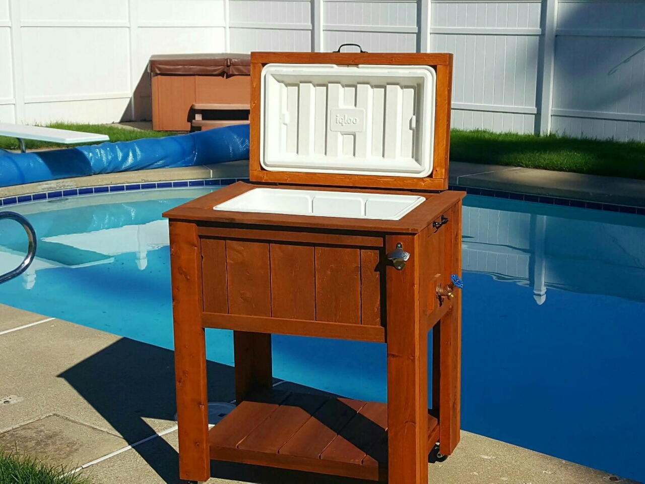 Attach any hardware you wish. I did hinges for the top, handles, bottle opener, and wheels.
