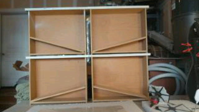 Mom had an old dresser that was falling apart so I was instructed to go hulk smash on it. From the lumber off of the dresser, I made these shelves and a rolling workbench.