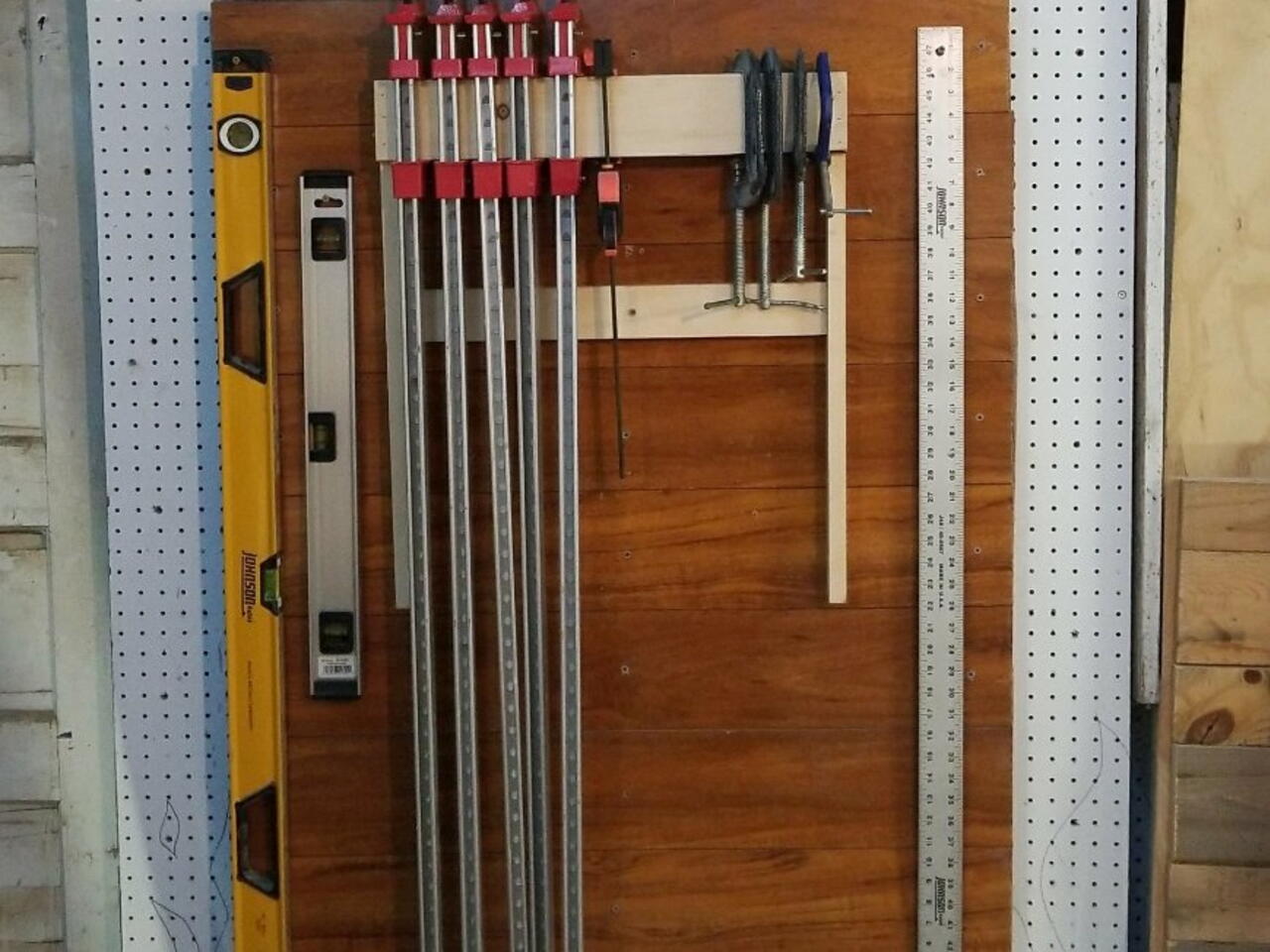 Figure the length you will need to fit all your clamps. Run two boards horizontally putting one on opposite sides of the vertical boards. Making a mounting plate to be secured to the wall