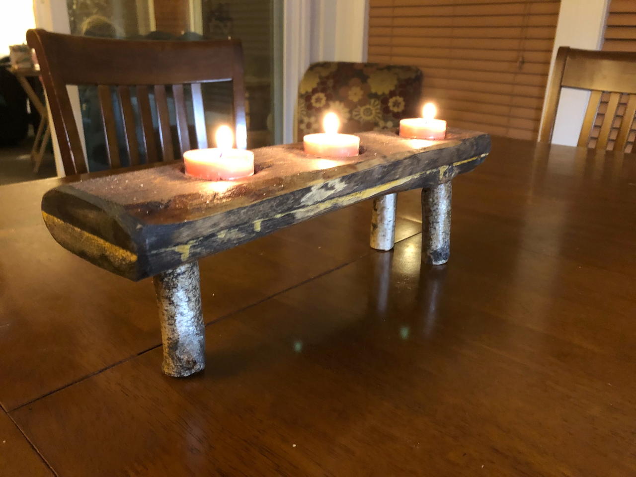 Glue 2 boards together, using a hole saw make the tea lite ports, dowel the birch branch match and glue