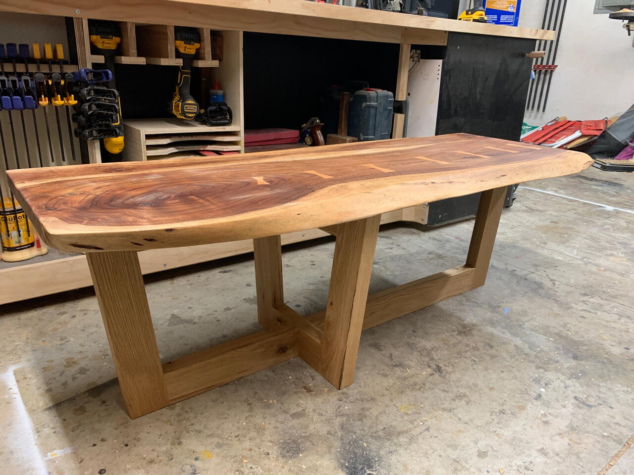 The slab on this table was found laying in the road. I picked it up and took it home. Turned out to be a walnut slab. It was in really rough shape so it took a bit of work to clean it up and stabilize the split. Beautiful piece of wood though!