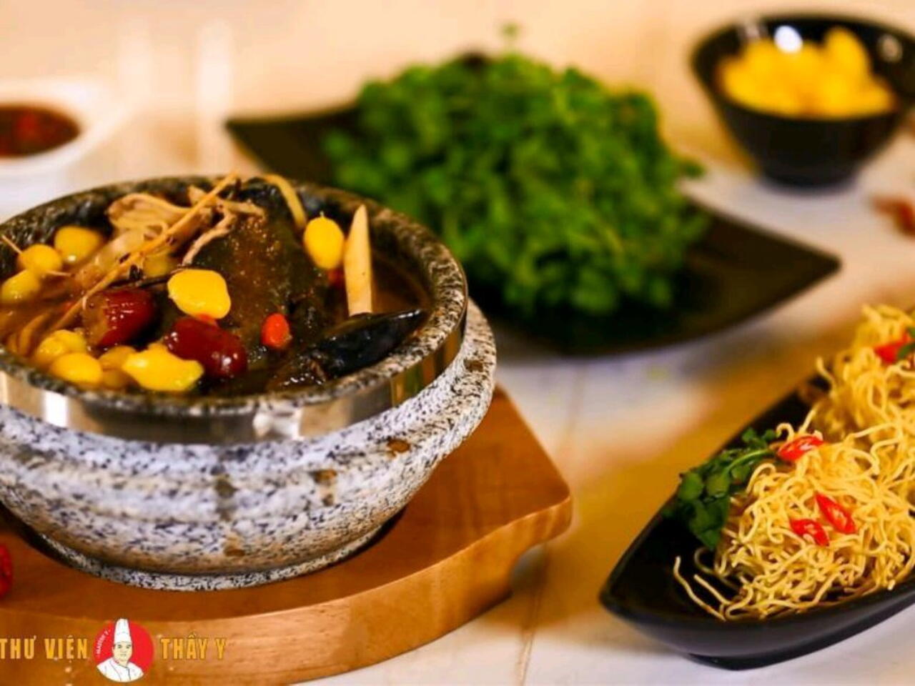 Mì sợi vàng tươi bóng hòa huyện vào nước lẩu đen của món gà hầm thuốc bắc không thể nào hút mắt hơn.